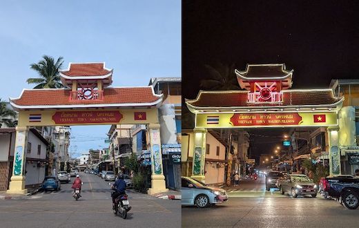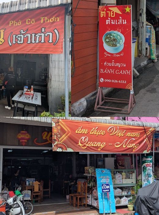 町の中心には、近年「タイ・ベトナム文化通り」の門が建設され、この通りにはフォー屋、バンカイン(米粉やタピオカ粉で作る麺、北中部地方では主に米粉麺)屋、ベトナム料理店がありました。中華街のように漢字の看板が並んでまるで中国という感じではなく、普通のタイの道にベトナム系のお店がポツポツある感じです。