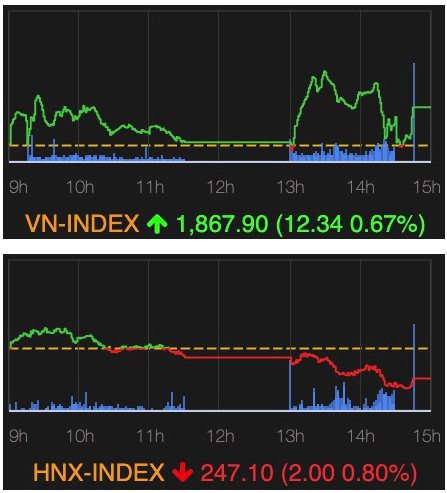 ホーチミン市場は1863.21(+0.41%)で寄り付いた後、さらに値を上げたが、中盤から前引けにかけて値を消した。後場に入り、一時1853.16 (▲0.13%)まで下落すると、すぐプラス圏に浮上、1880.16(+1.33%)まで上昇した。その後は引けにかけて再び値を消し、VNインデックスは+12.34ポイント(+0.67%)高の1867.90で引けた。