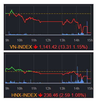 終値 前営業日比 騰落率(%) VN指数 1141.42 -13.31 -1.15 VN30指数 1153.21 -13.45 -1.15 VNMID指数 16...