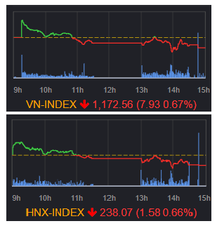 終値 前営業日比 騰落率(%) VN指数 1172.56 -7.93 -0.67 VN30指数 1182.97 -10.54 -0.88 VNMID指数 160...