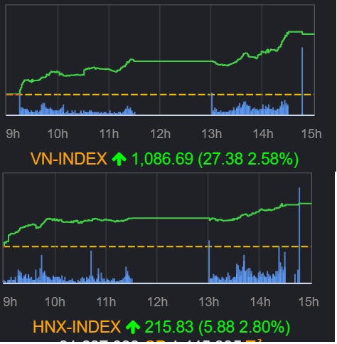 終値 前営業日比 騰落率(%) VN指数 1086.69 +27.38 +2.58 VN30指数 1087.36 +33.64 +3.19 VNMID指数 13...