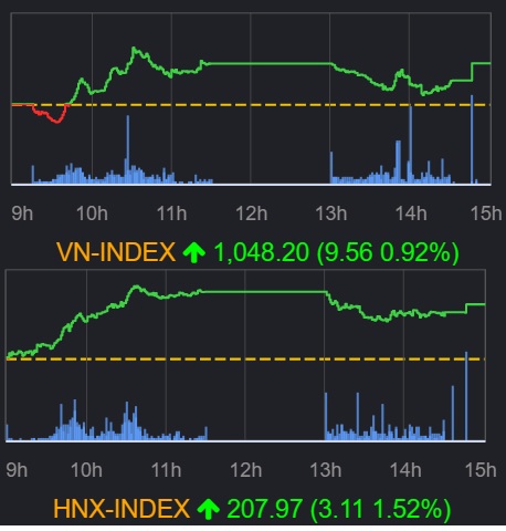 終値 前営業日比 騰落率(%) VN指数 1048.20 +9.56 +0.92 VN30指数 1043.34 +8.41 +0.81 VNMID指数 1289...