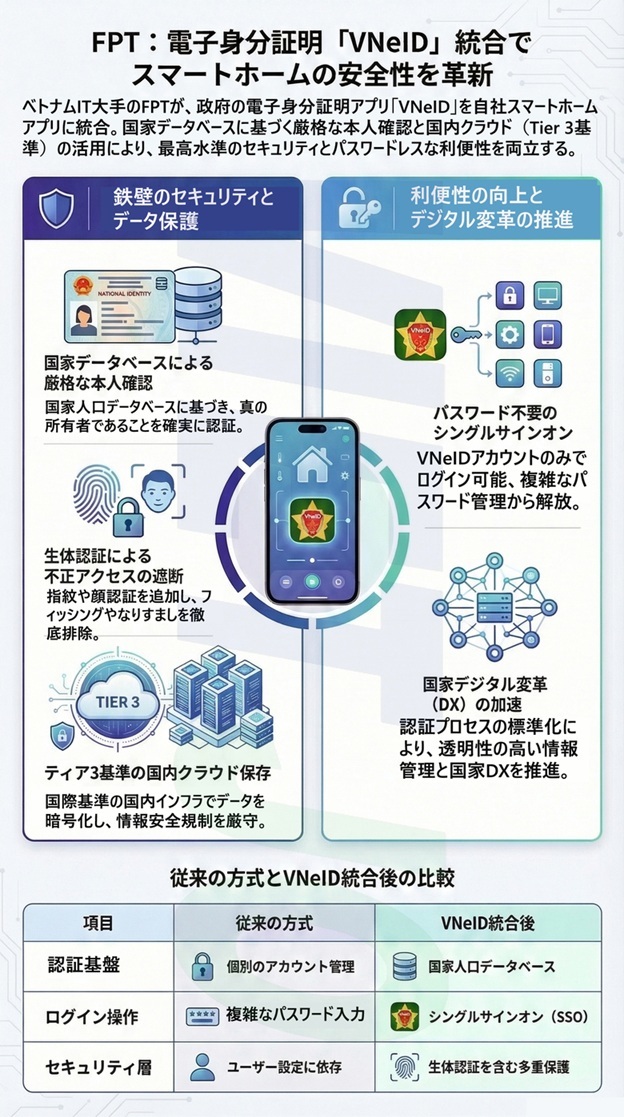 ベトナムのIT最大手FPT情報通信[FPT](FPT Corporation)傘下のFPTテレコム[FOX](FPT Telecom)はこのほど、自社のスマートホームエコシステムを管理するアプリ「FPTライフ(FPT Life)」に、電子身分証明アプリ「VNeID」によるログイン機能を統合した。これにより、カメラデータのセキュリティが向上し、アクセスが簡素化される。