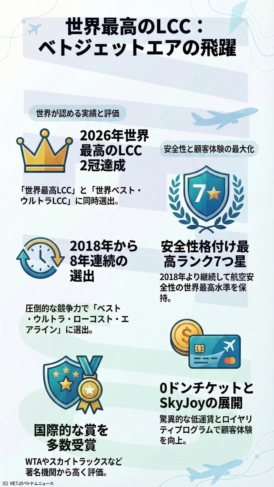 国内最大手の格安航空会社ベトジェットエア[VJC](Vietjet Air)は、世界唯一の航空安全・製品格付けサイト「エアラインレイティングス(AirlineRatings)」による「世界のベストエアライン・アワーズ(World’s Best Airlines Awards)」2026年版で、「世界のベスト・ウルトラ・ローコスト・エアライン(World’s Best Ultra Low Cost Carrier)」と「世界最高の格安航空会社(World’s Best Low-Cost Airlines)」に選出されたと発表した。