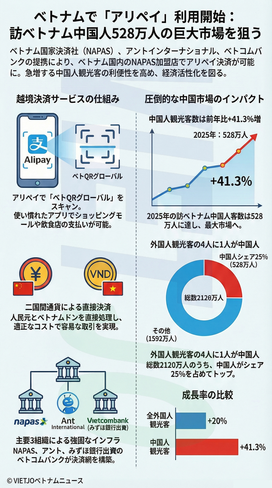 この連携を通じて、中国人観光客は阿里巴巴集団(アリババ=Alibaba)傘下で中国最大規模のオンライン決済サービスを手掛ける支付宝(アリペイ=Alipay)の決済アプリ「アリペイ」を使用して、越境決済の「ベトQRグローバル(VietQRGlobal)」のコードをスキャンし、ベトナム国内のNAPAS加盟店ネットワークでの支払いが可能になる。