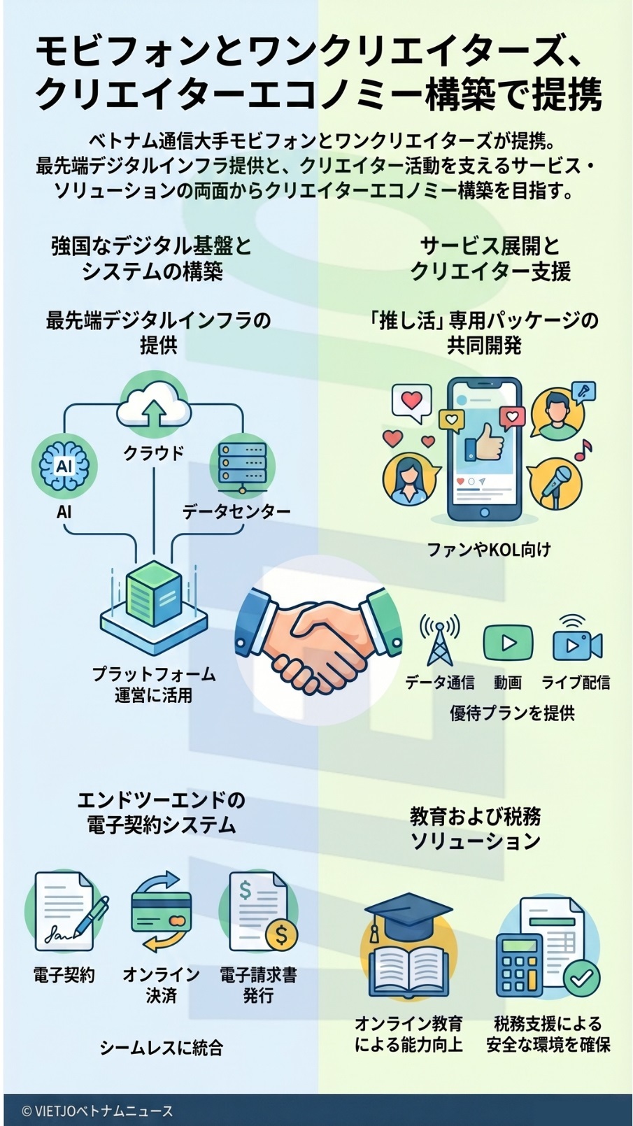 携帯通信大手のモビフォン(Mobifone)のホーチミン市支店と、地場系大手総合メディア会社イエーワングループ[YEG](YeaH1 Group)傘下のワンクリエイターズ(1Creators)はこのほど、ホーチミン市でクリエイターエコノミーの構築に関する覚書(MOU)を締結した。