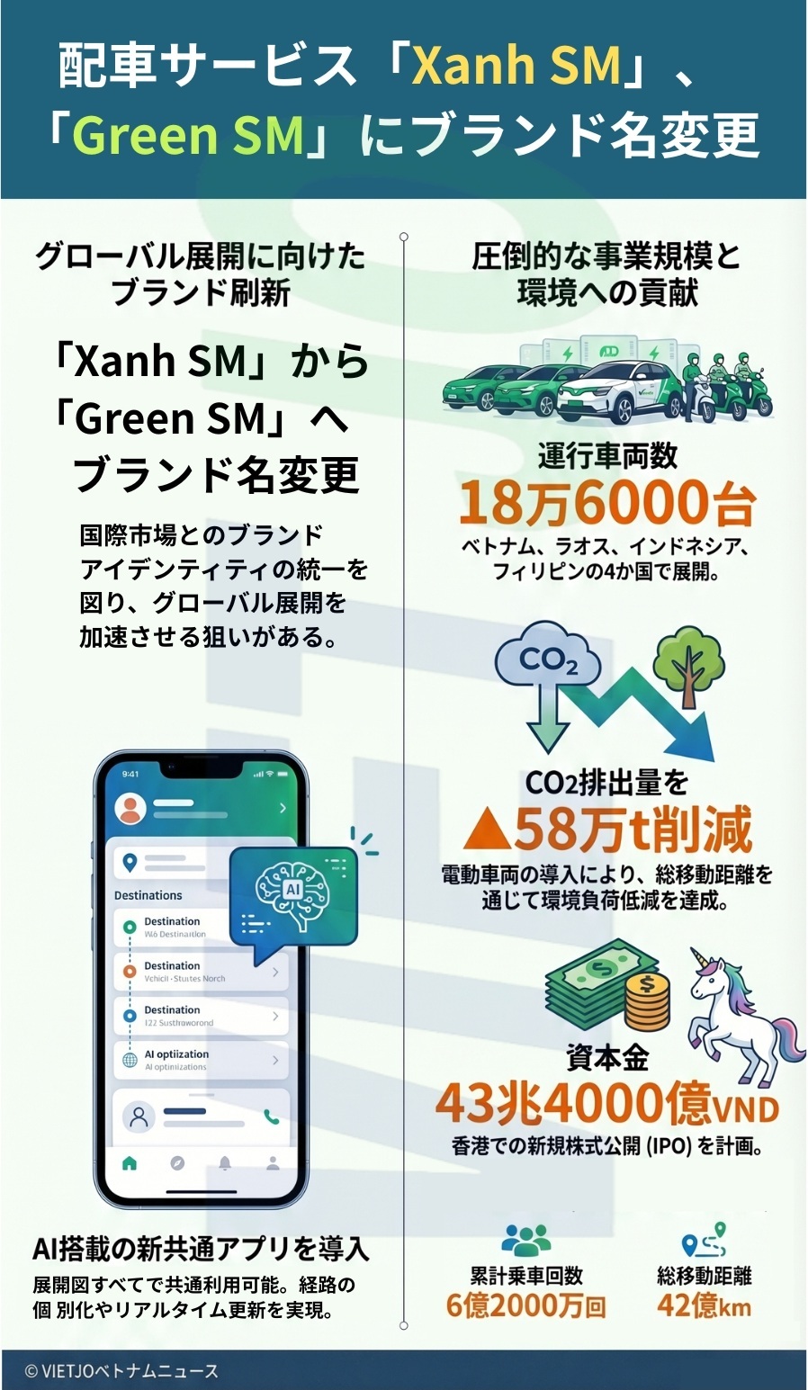 グリーンSMは事業開始から3年が経過し、現在はベトナム、ラオス、インドネシア、フィリピンの4か国で事業を展開しており、18万6000台以上のEVおよび電動バイクを運行している。これまでに約6億2000万回の乗車を記録し、総移動距離は42億kmに達して、二酸化炭素(CO2)排出量を▲58万t削減した。