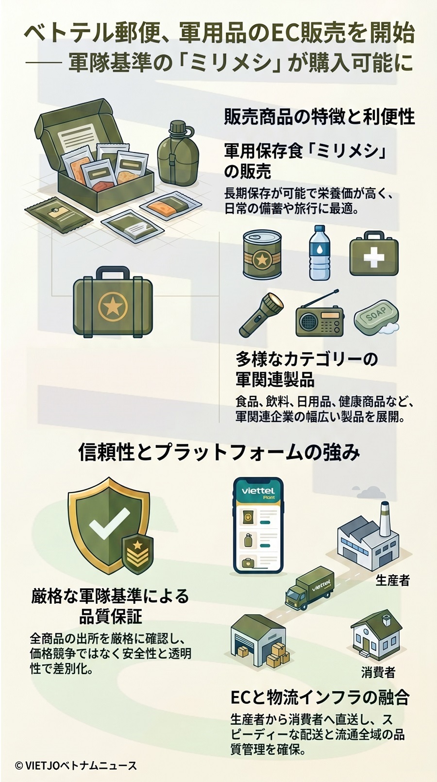 今回の軍用品カテゴリーの追加は、商品の選択肢を広げるだけでなく、市場における信頼できる消費の選択肢を生み出すことにもつながる。ベトテル郵便は今後も消費者の高まるニーズに応えるべく、商品の多様化を図り、同カテゴリーを発展させていく予定だ。
