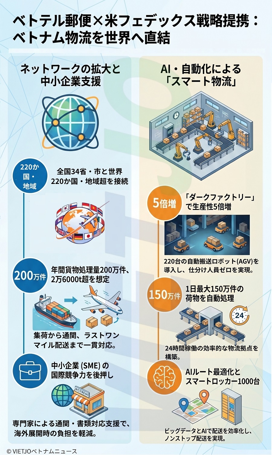 VTPはフェデックスのベトナム全国におけるネットワーク運営パートナーとなる。フェデックスはVTPの全国34省・市に広がるネットワークと豊富な配送車両を活用し、一方のVTPはフェデックスの220か国・地域超に及ぶグローバル配送網にアクセスすることで、ベトナム企業、特に中小企業(SME)の国際競争力向上を後押しする。