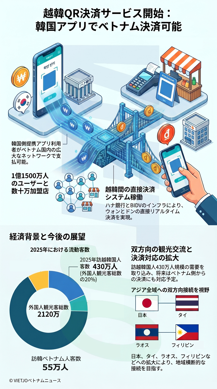 同サービスは、2025年8月に開催されたベトナム・韓国経済フォーラムで締結された協力合意書に基づくもので、1年足らずでシステム接続や決済インフラの統合を完了し、正式運用に至った。