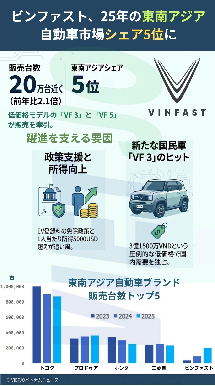 英系コンサルティング会社のプライスウォーターハウスクーパース(PwC)の報告によると、不動産開発を中核とする民間複合企業ビングループ[VIC](Vingroup)傘下の電気自動車(EV)メーカーであるビンファスト(Vinfast)は、2025年の販売台数が前年比2.1倍増と急成長し、東南アジアの自動車市場シェアで11位から5位に躍進した。
