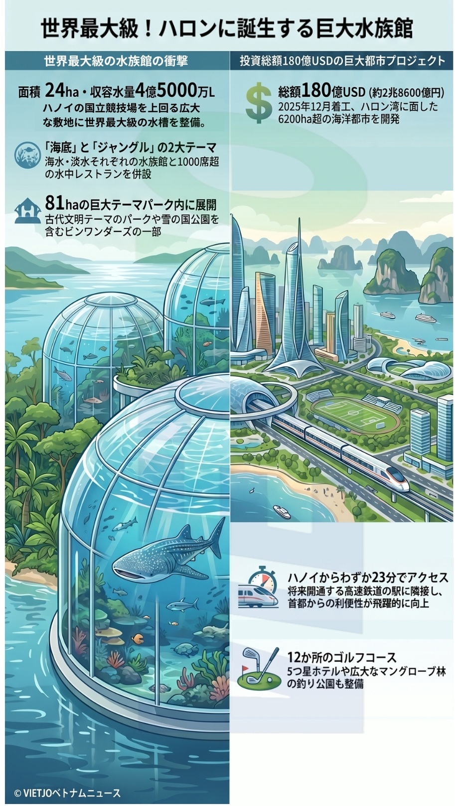 不動産開発を中核とする民間複合企業ビングループ[VIC](Vingroup)の子会社で住宅開発最大手ビンホームズ[VHM](Vinhomes)はこのほど、東北部地方クアンニン省で開発する巨大な海洋都市プロジェクト「ビンホームズ・グローバル・ゲート・ハロン(Vinhomes Global Gate Ha Long)」の建設計画を発表した。同都市には、世界最大の水族館が建設される見通しだ。