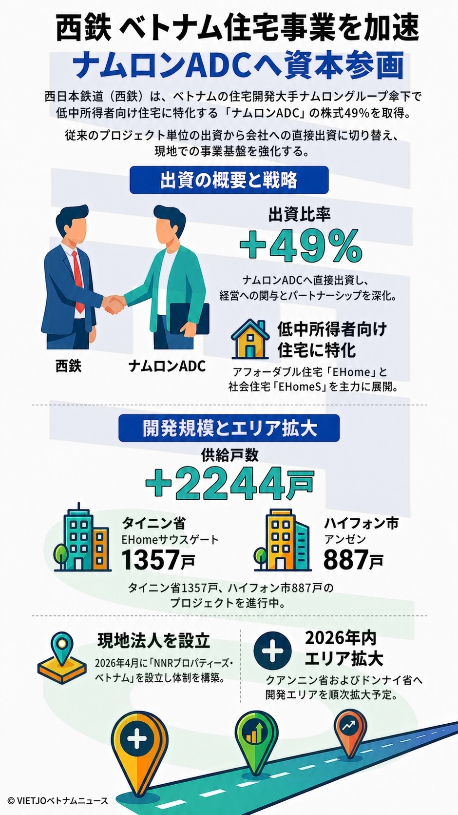 今回の出資により、西日本鉄道はナムロンADCの定款資本の49%を取得する。ナムロンADCは2007年の設立で、ホーチミン市に本社を置き、アフォーダブル住宅「EHome」や社会住宅「EHomeS」の2ブランドを展開している。