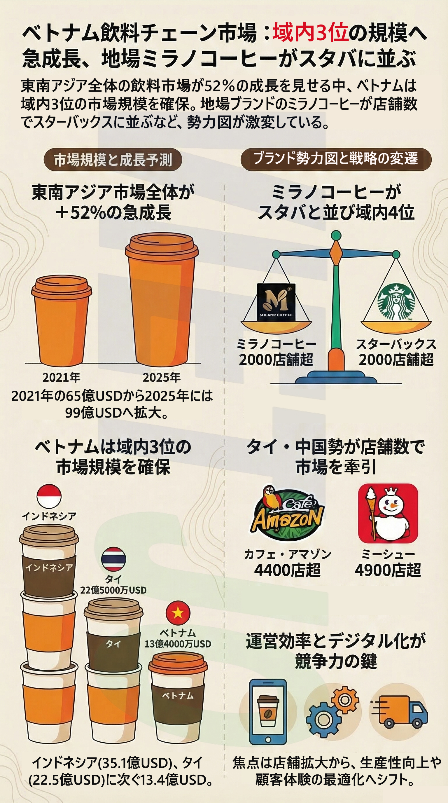 2026年2月時点で、東南アジアにおいて1000店舗余りを展開するコーヒーチェーンは7ブランド存在する。ベトナムからは「ミラノ」が唯一ランクインし、店舗数は2000店超で、米コーヒーチェーン大手「スターバックス(Starbucks)」と並び域内第4位に位置している。
