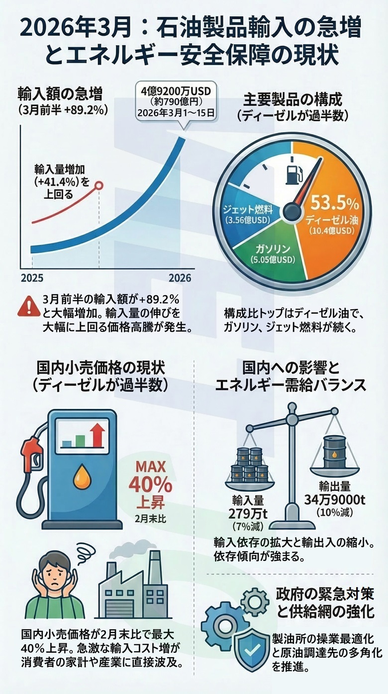 税関局の速報データによると、2026年3月前半(1日から15日まで)における各種石油製品の輸入量は前年同期比+41.4%増の53万3000t、輸入額は同+89.2%増の4億9200万USD(約790億円)に急増した。中東情勢の緊迫化に伴う世界的なエネルギー価格の高騰が背景にある。