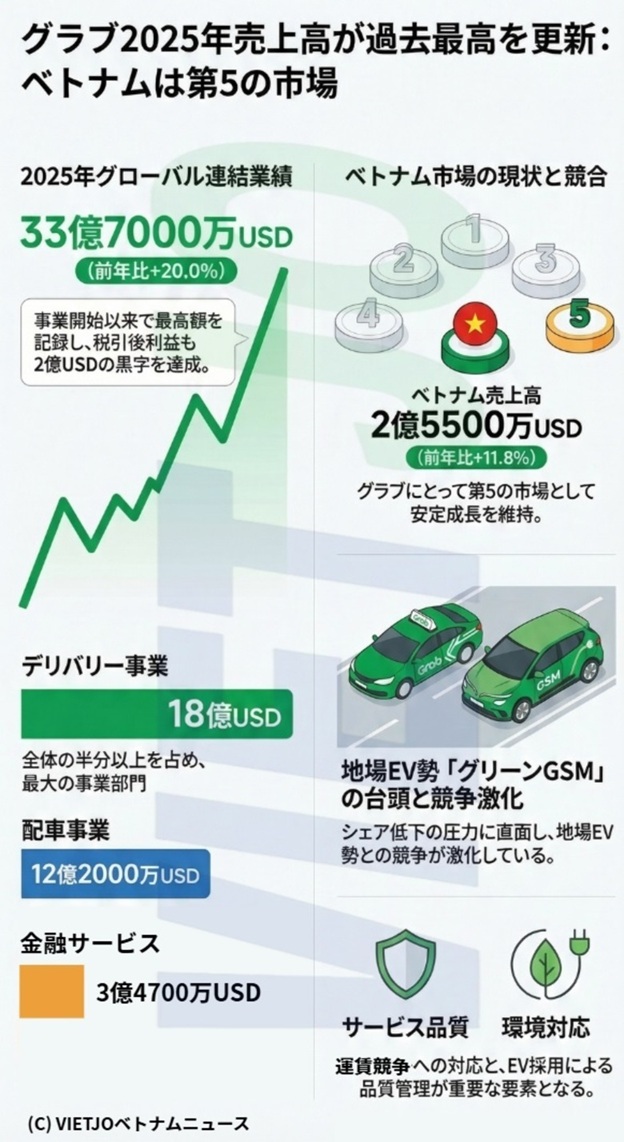シンガポール系グラブ(Grab)が発表した2025年年次報告書によると、同年の連結売上高は前年比+20.0%増の33億7000万USD(約5400億円)に達し、事業開始以来で最高となった。このうち、現地法人グラブベトナム(Grab Vietnam)の売上高は前年比+11.8%増の2億5500万USD(約405億円)で、グラブにとって第5の市場となっている。