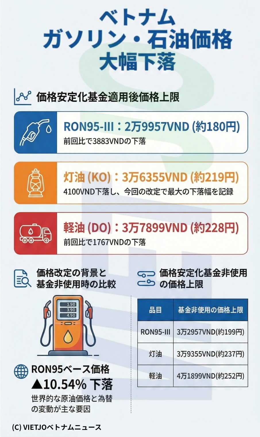 今回の価格上限引き下げは、世界的な原油価格の変動やVND/USD為替レートの変動を受け、RON95-IIIのベース価格が直近の改定時から▲10.54%下落したことに伴うもの。