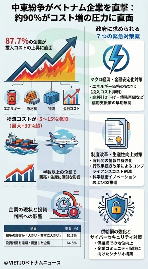 行政手続き改革顧問評議会傘下の民間経済開発研究委員会(IV委員会)が先般発表した中東における軍事衝突に関する調査報告書によると、ベトナム国内企業の約90%が投入コストの上昇圧力を受けていることが分かった。この影響は企業のキャッシュフローや利益率を直接的に圧迫し、国内経済に深刻な影響を及ぼしている。