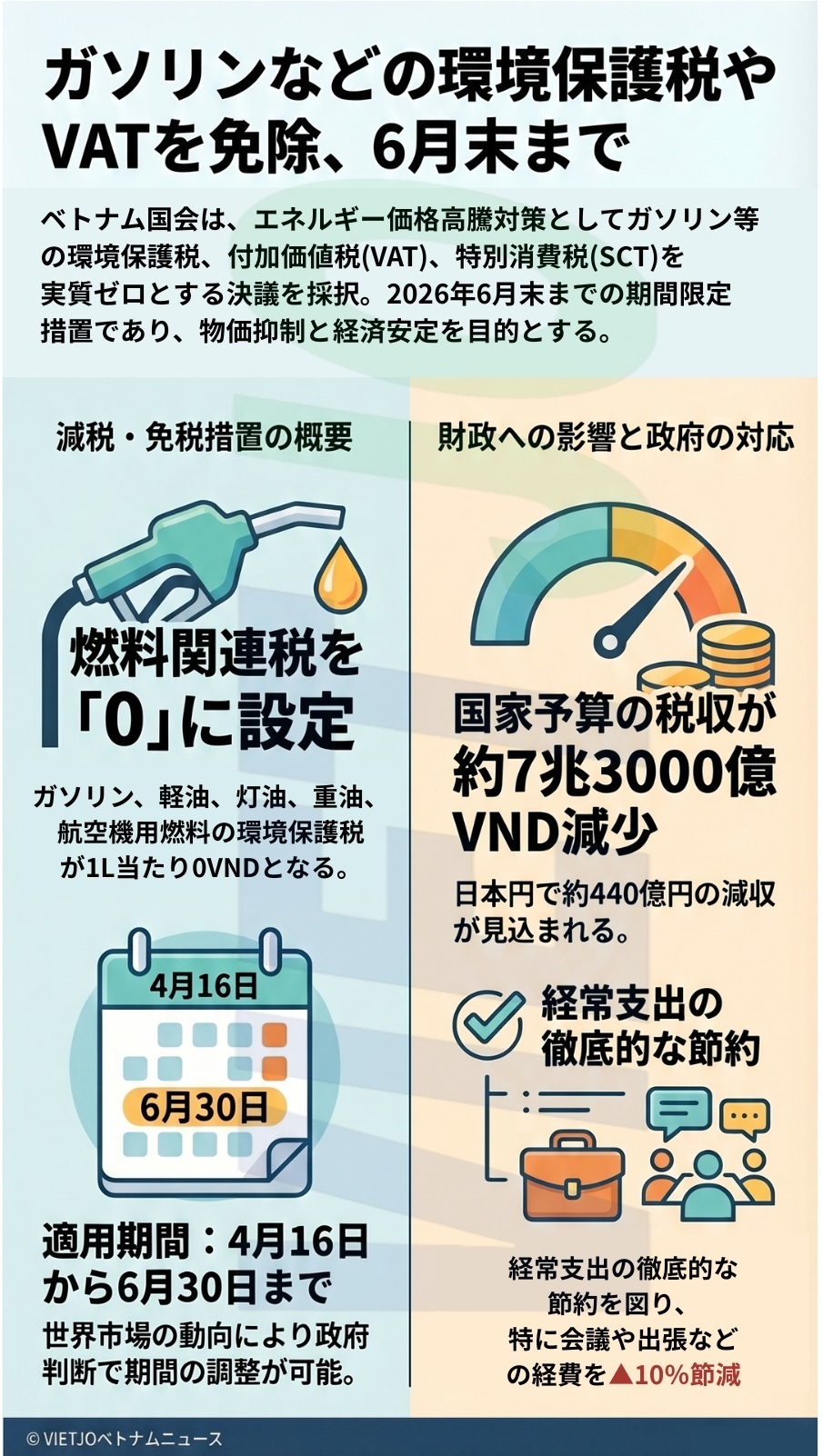 政府はこれに先立ち、中東情勢の緊張によるエネルギー価格の高騰を受けた緊急措置として、3月27日から4月15日まで同様に各種税を免除する決定第482号/QD-TTgを公布していた。今回の国会決議により、この緊急措置が実質的に延長される形となる。また、政府は供給逼迫リスクに対応するため、輸入関税を0%に引き下げる政令第72号/2026/ND-CPを3月に公布しており、こちらは4月30日まで適用されている。