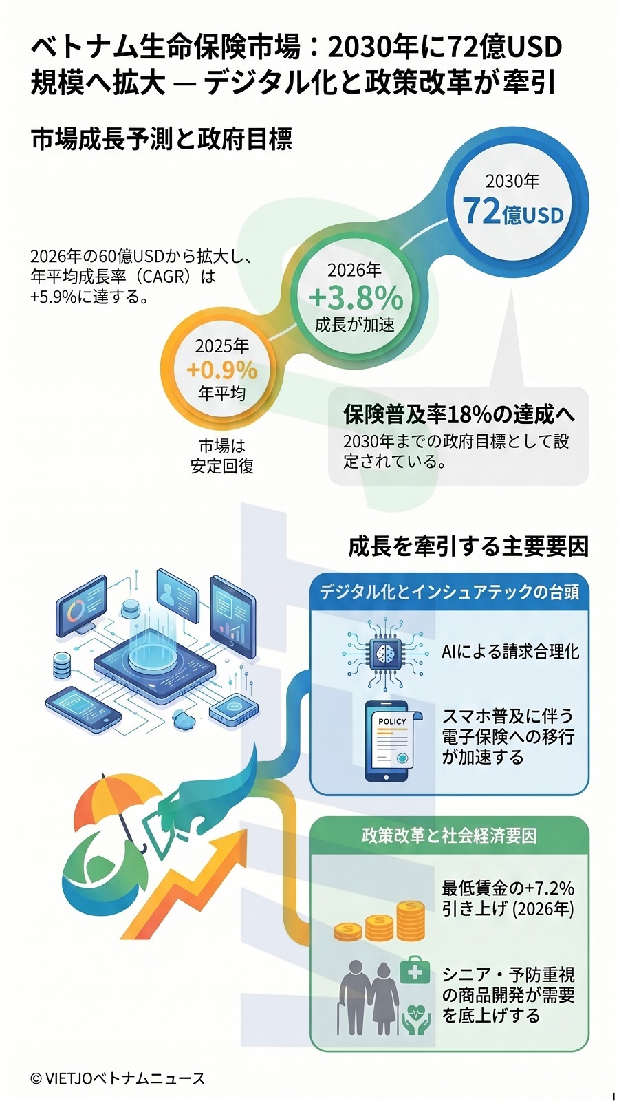 英国・ロンドンに本拠を置くデータ分析およびコンサルティング会社のグローバル・データ(GlobalData)が発表した最新のレポートによると、ベトナムの生命保険業界の保険料収入は、2026年の60億USD(約9500億円)から2030年には72億USD(約1兆1400億円)となり、年平均成長率(CAGR)+5.9%で拡大する見通しだ。