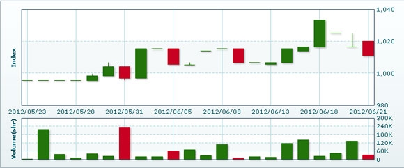 6月22日のラオス総合指数は前日比変わらずの1011.19で取引を終えた。売買高は前日比10.2倍の38万3325株、売買代金は同9.5倍の17億8863万キープだった。