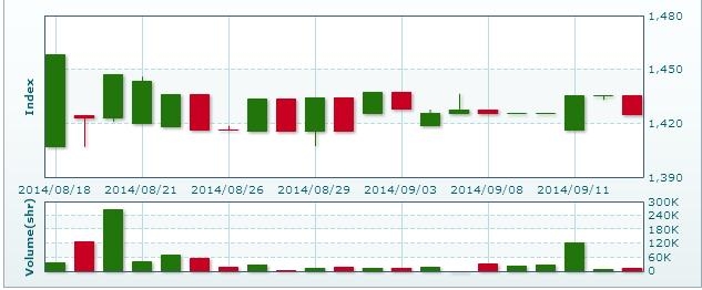 ラオス総合指数1424.82▲10.64ポイント(0.74%)安
