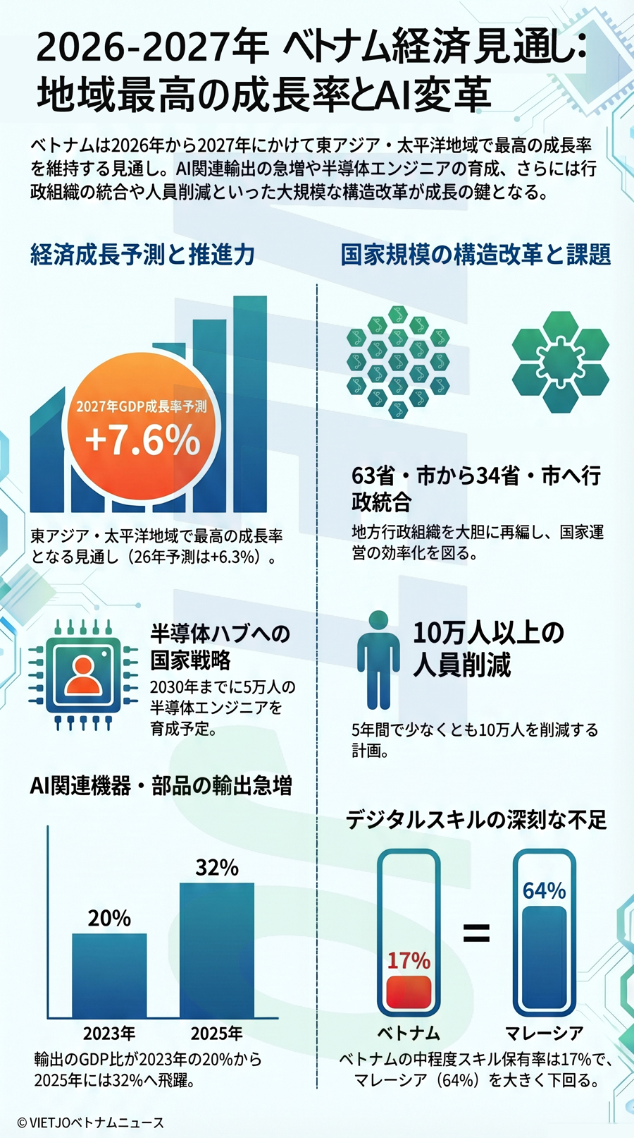ベトナムの成長の原動力は、公共投資、民間投資、および安定した海外直接投資(FDI)だ。FDI企業は輸出総額の73%を占め、ベトナムの貿易依存度はGDPの184%に達する。特に人工知能(AI)関連の輸出と投資が急増しており、AI関連機器・部品の輸出は2023年のGDP比約20%から2025年には約32%へ飛躍的に増加した。
