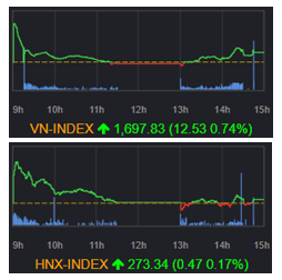 ホーチミン市場は、1701.06 (+0.94%)で寄り付いた後、さらに1704.42 (+1.13%)まで上昇すると反落、値を消し、前引け直前にマイナス圏に転落した。後場に入ると、プラス圏に浮上、もみ合いながら値を上げる展開となり、VNインデックスは+12.53ポイント(+0.74%)高の1697.83で引けた。