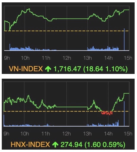 ホーチミン市場は1702.76 (+0.29%)で寄り付いた後、もみ合いながら値を上げ、中盤に1717.65 (+1.17%)まで上昇する局面もあった。その後は前引けにかけて値を消し上げ幅を縮小した。後場に入ると、再び値を上げる展開となり、VNインデックスは+18.64ポイント(+1.10%)高の1716.47の高値圏で引けた。