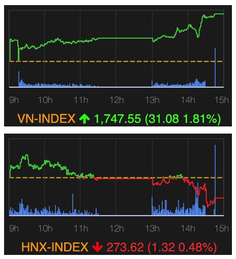 ホーチミン市場は、1725.27 (+0.51%)で寄り付いた後、前引けにかけてプラス圏で小幅な値動きでもみ合った。後場に入ると、買いが強まったことでもみ合いながら上げ幅を拡大し、終盤に1747.61 (+1.814%)まで上昇する局面もあった。引けで若干値を消し、VNインデックスは+31.08ポイント(1.811%)高の1747.55の高値圏で引けた。