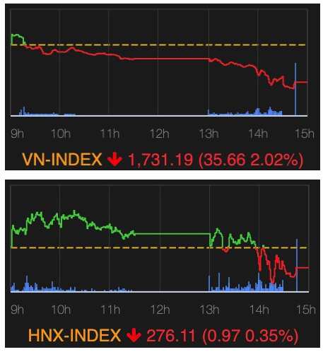 ホーチミン市場は、1773.17 (+0.36%)の高値で寄り付いた後、暫く前日終値付近で小幅な値動きでもみ合ったが、その後は売り先行で後場にかけて反発らしい反発もなくだらだらと値を下げる展開となった。後場の終盤に1725.10 (▲2.36%)まで下落すると、若干値を戻し、VNインデックスは▲35.66ポイント(▲2.02%)安の1731.19の安値圏で引けた。