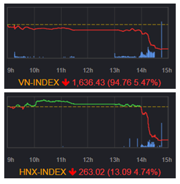 ホーチミン市場は1723.59 (▲0.44%)で寄り付いた後、前引けにかけてマイナス圏でもみ合う状態が続いた。後場に入ると売りが入ったことで引けにかけて値を下げる展開となり、VNインデックスは▲94.76ポイント(▲5.47%)安の1636.43の安値で引けた。