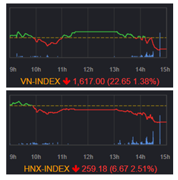 ホーチミン市場は1644.56 (+0.3%)で寄り付いた後、一時値を上げた。1652.48 (+0.78%)まで上昇すると失速、値を下げた。前場の中盤に買いが入ったことで前引けにかけて値を上げる展開となった。後場に入ると再び値を下げ、引けにかけて下げ幅を拡大し、VNインデックスは▲22.65ポイント(▲1.38%)安の1617.0の安値で引けた。