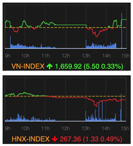 ホーチミン市場は1657.43 (+0.18%)で寄り付いた後、買いが先行し、一時1660.41 (+0.36%)まで上昇した。その後は前引けにかけて一進一退で方向感のない取引が続いた。後場に入ると売りが入ったことで値を下げた。1647.64 (▲0.41%)まで下落すると反発、引けにかけて下げ幅を縮小し、VNインデックスは+5.5ポイント(+0.33%)高の1659.92で引けた。
