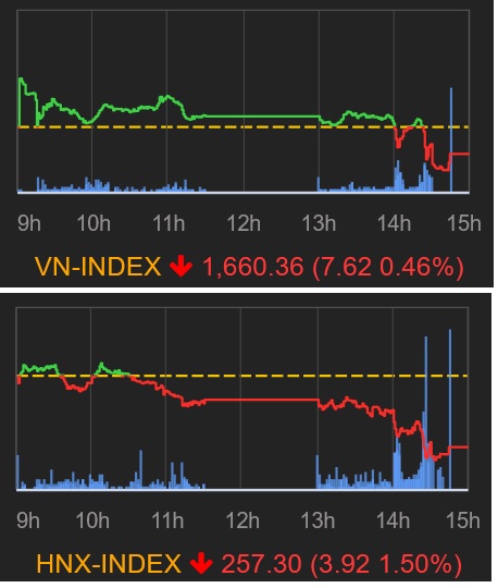 ホーチミン市場は1670.08 (+0.13%)で寄り付いた後、値を下げた。その後は前引けにかけてプラス圏で一進一退でもみ合う状態が続いた。後場に入ると、下げ幅を拡大する展開となり、引け際に1655.73 (▲0.73%)まで下落する局面もあり、VNインデックスは▲7.62ポイント(▲0.46%)安の1660.36で引けた。