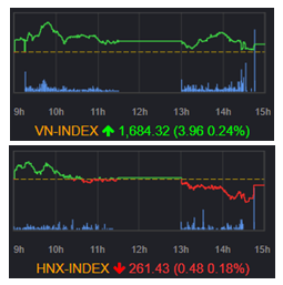 ホーチミン市場は1686.03 (+0.34%)で寄り付いた後、暫く上昇し、前場の中盤に1695.34 (+0.89%)まで上昇する局面があった。その後は前引けにかけて値を消し上げ幅を縮小した。後場に入ると、プラス圏でもみ合う展開となり、VNインデックスは+3.96ポイント(+0.24%)高の1684.32で取引を終えた。