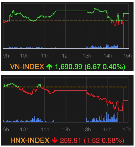 ホーチミン市場は1683.77 (▲0.03%)で寄り付いた後、買いが優勢となり上昇、前引けにかけてプラス圏でもみ合った。後場に入り、1696.14(+0.70%)まで上昇する局面もあったが、その後は反落、値を消す展開となった。終盤にマイナス圏に転落、1679.12(▲0.31%)まで下落すると反発、プラス圏に浮上、VNインデックスは+6.67ポイント(+0.40%)高の1690.99で引けた。