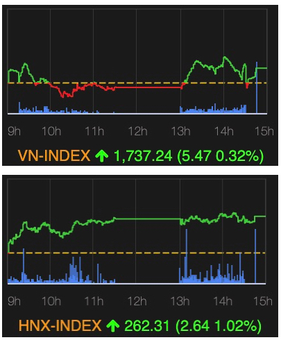 ホーチミン市場は1735.41 (+0.21%)で寄り付いた後、暫く値を上げたが、前場の中盤からマイナス圏に転落、1725.23 (▲0.38%)まで下落する場面も見られた。後場に入ると、主にプラス圏でもみ合い、中盤に1741.71 (+0.57%)まで上昇すると若干値を消し、VNインデックスは+5.47ポイント(+0.32%)高の1737.24で取引を終えた。