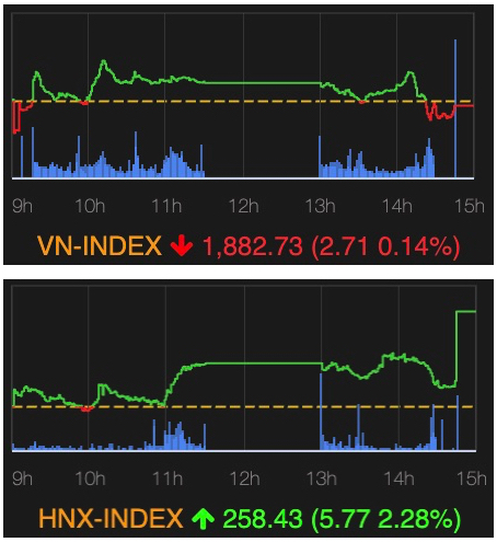 ホーチミン市場は1895.08 (+0.51%)で寄り付いた後、マイナス圏に転落、1874.81 (▲0.56%)まで下落した。その後は反発、値を上げ、前場の終盤に1904.56 (+1.01%)まで上昇する局面もあった。後場に入ると、プラス圏でもみ合ったが、終盤に再びマイナス圏に転落し、VNインデックスは▲2.71ポイント(▲0.14%)安の1882.73で引けた。