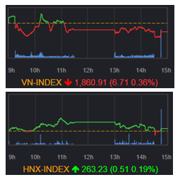 ホーチミン市場は1869.49(+0.10%)で寄り付いた後、前場はもみ合いながら推移し、一時1876.01(+0.45%)まで上昇する場面もあった。後場に入ると、マイナス圏でもみ合い、終盤に一時1855.89(▲0.63%)まで下落する局面もあった。その後は若干値を戻し、VNインデックスは▲6.71ポイント(▲0.36%)安の1860.91で引けた。