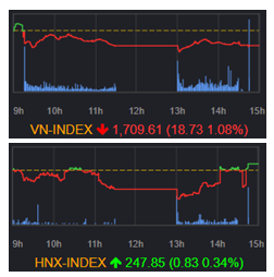 ホーチミン市場は1716.62(▲0.68%)で寄り付いた後、前場は売り優勢となり下落基調で推移した。後場に入り一時1701.59(▲1.55%)まで下落する場面もあったが、その後はやや持ち直した。VNインデックスは▲18.73ポイント(▲1.08%)安の1709.61で取引を終えた。