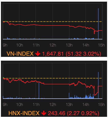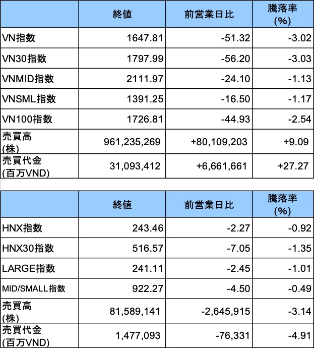 ホーチミン証券取引所(HSX)では、VNインデックスが前日比▲51.32ポイント(▲3.02%)下落の1647.81で引けた。VN30インデックスも▲56.20ポイント(▲3.03%)と急落し1797.99まで落ち込んだ。ハノイ証券取引所(HNX)のHNXインデックスは同▲2.27ポイント(▲0.92%)下落の243.46となった。市場全体で売りが優勢となり、HSXの売買代金は前日比で+27%増加し、約31兆0934億VND(約1870億円)に急増した。