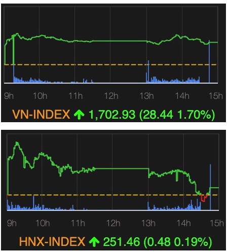 ホーチミン証券取引所(HSX)のVNインデックスは前営業日比+28.44ポイント(+1.70%)上昇し、1702.93ポイントで取引を終えた。ハノイ証券取引所(HNX)のHNXインデックスも同+0.48ポイント(+0.19%)上昇の251.46ポイントで引けた。HSXの売買代金は前営業日比+20.0%増加の29兆2456億VND(約1760億円)と大幅に膨らみ、優良株への強い資金流入が確認された。一方、HNXの売買代金は同▲6.6%減少の1兆9856億VND(約119億円)となった。