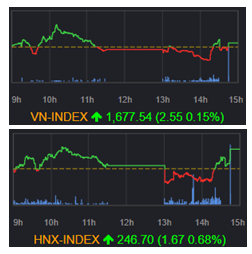 VNインデックスは前営業日比+2.55ポイント(+0.15%)上昇し、1677.54ポイントで引けた。前日まで3営業日連続で下落していたが、終盤に買い戻しが入りプラス圏を回復した。売買代金は前営業日から大幅に減少し、15兆1522億VND(約910億円)と閑散な取引となった。HNXインデックスは前営業日比+1.67ポイント(+0.68%)上昇の246.7ポイントで取引を終えた。売買代金は9919億VND(約60億円)だった。