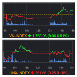 VNインデックスは前日比+8.96ポイント(+0.51%)上昇し、1758.96で引けた。売買代金は22兆5323億VND(約1370億円)と前営業日から▲8.6%減少した。HNXインデックスは前日比▲0.25ポイント(▲0.10%)下落し、251.66で引けた。売買代金は1兆4354億VND(約87億円)だった。