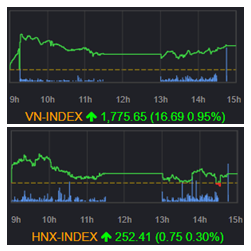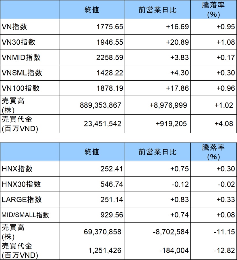 ホーチミン証券取引所(HSX)のVNインデックスは前日比+16.69ポイント(+0.95%)上昇し、1775.65ポイントで引けた。売買代金は23兆4515億VND(約1420億円)となり、前日から小幅に増加して安定した水準を保った。ハノイ証券取引所(HNX)のHNXインデックスは同+0.75ポイント(+0.30%)上昇し、252.41ポイントで取引を終えた。売買代金は1兆2514億VND(約76億円)だった。