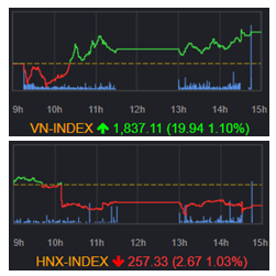 VNインデックスは1837.11ポイントで取引を終え、前日比+19.94ポイント(+1.10%)と大幅に上昇した。ただし、市場全体の流動性は低下傾向にあり、売買代金は21兆7036億VND(約1300億円)に留まった。一方、HNXインデックスは257.33ポイントで、前日比▲2.67ポイント(▲1.03%)と反落した。売買代金は8459億VND(約51億円)であった。