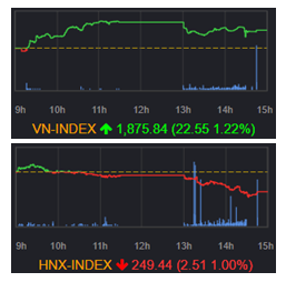 HSXのVNインデックスは前日比+22.55ポイント(+1.22%)上昇し、1875.84ポイントで取引を終えた。売買代金は19兆4220億VND(約1170億円)と前日から小幅増にとどまり、相場が上昇する一方で投資家の慎重な姿勢がうかがえる。