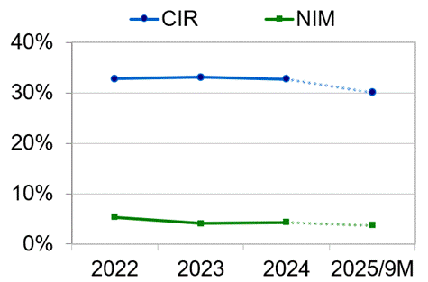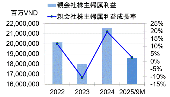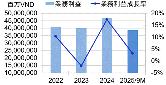 2025年1~9月期業績(監査無し)は、業務利益が前年同期比+3.1%増の38兆5964億VNDへと小幅に増加した。