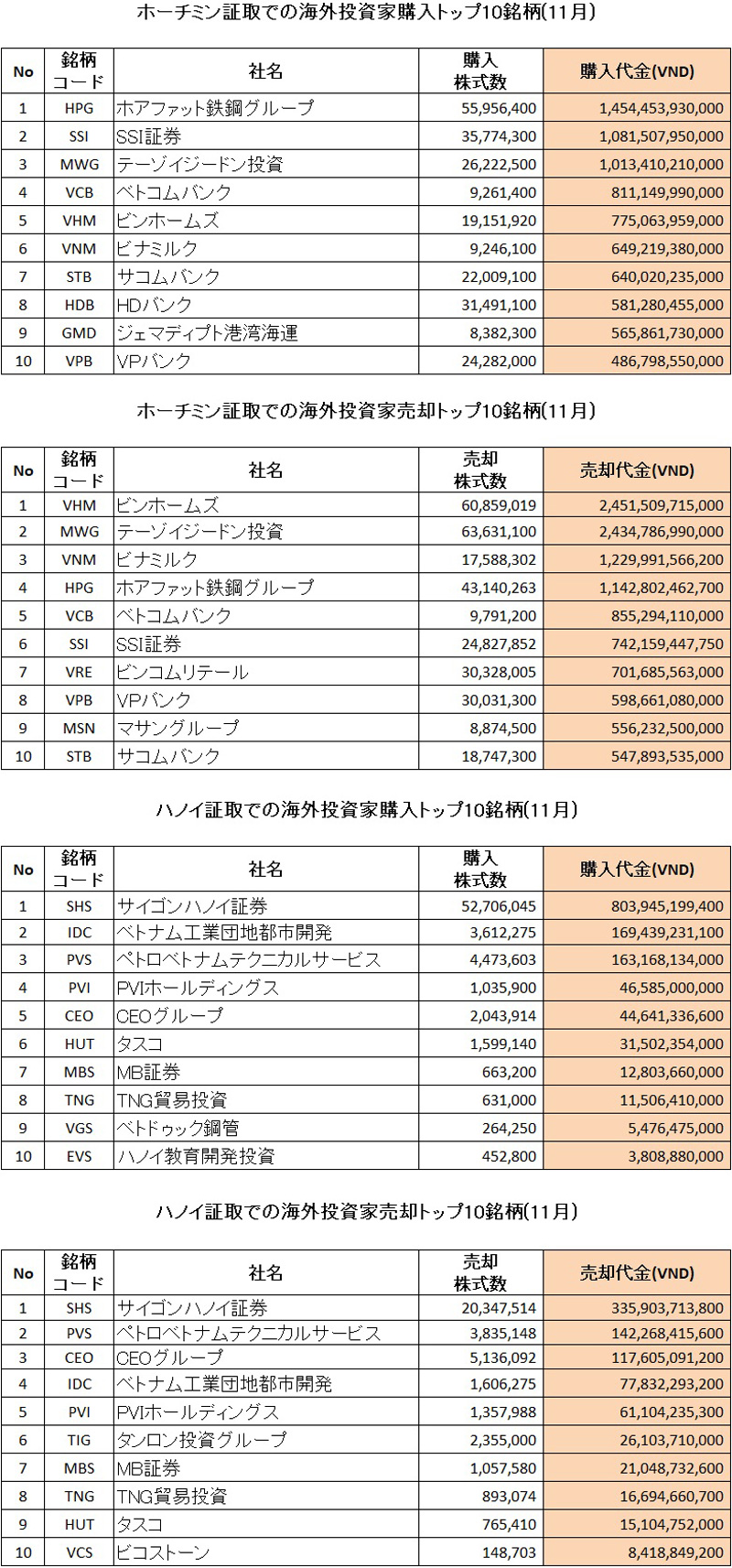 終値 前営業日比 騰落率(%) VN指数 1102.16 +8.03 +0.73 VN30指数 1090.39 +8.69 +0.80 ...